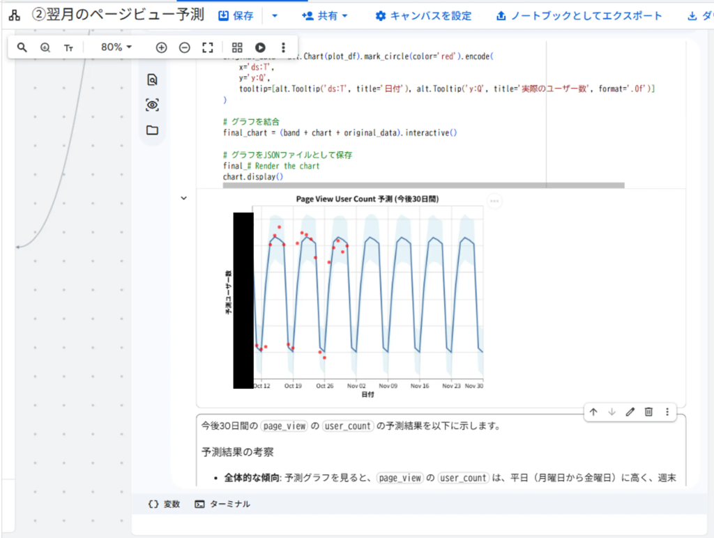 GAデータのインサイトを深く探索できます。パターンの発見、統計分析を使った予測をSQLやPythonを用いて生成あるいは提案して、実行できます。BigQueryデータキャンバスなど可視化の機能も多様です。