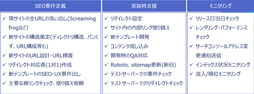 何より重要なことはリニューアル時の要件定義の段階でSEO要件を洗い出し、開発・制作の実装対象に含めてもらうことです。