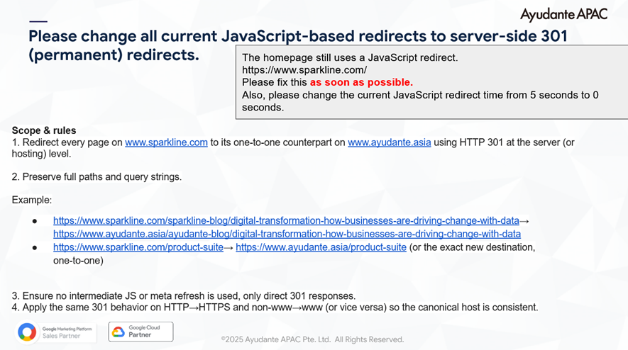 リダイレクトは非常に重要です。ここで失敗しているサイトを多数目にしてきました(今回私たちも失敗しましたが…)。