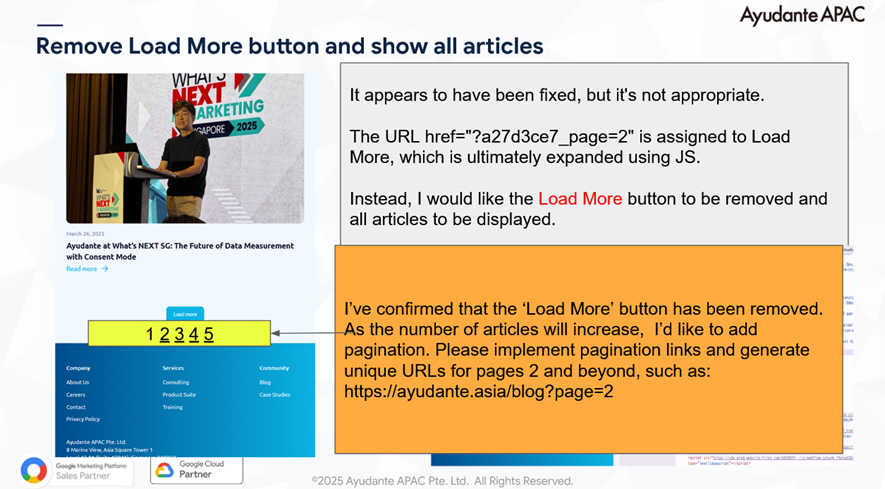 このような課題に気づき、SEOエンジニアの西村さんとともに改善案を資料にまとめて制作会社へ依頼しました。制作会社はインドネシアの会社だったので、コミュニケーションも修正プロセスも紆余曲折あり(とても大変でした…)、制作コストは安くともこれだけ社内コストを使うのは結局どうなのだろうとも思いました(笑。