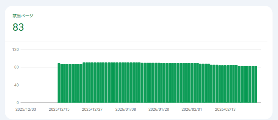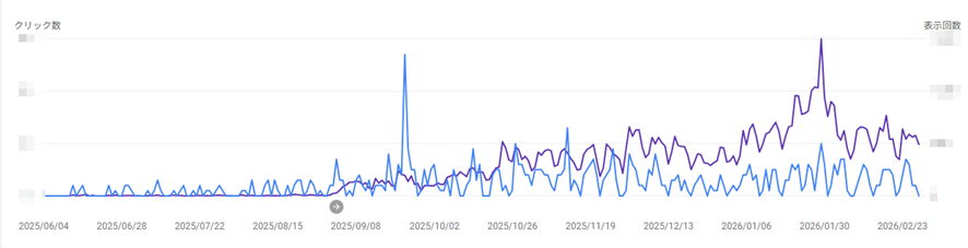 インデックス数が無事に増えて安定し、クリック数は大きくは伸びてはいませんが表示回数が増加し、徐々に評価されてきていることを感じます。