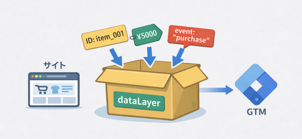 サイト側のデータを一時的に保存し、GTMに受け渡すための「箱」のようなものとイメージすると理解しやすいかもしれません。