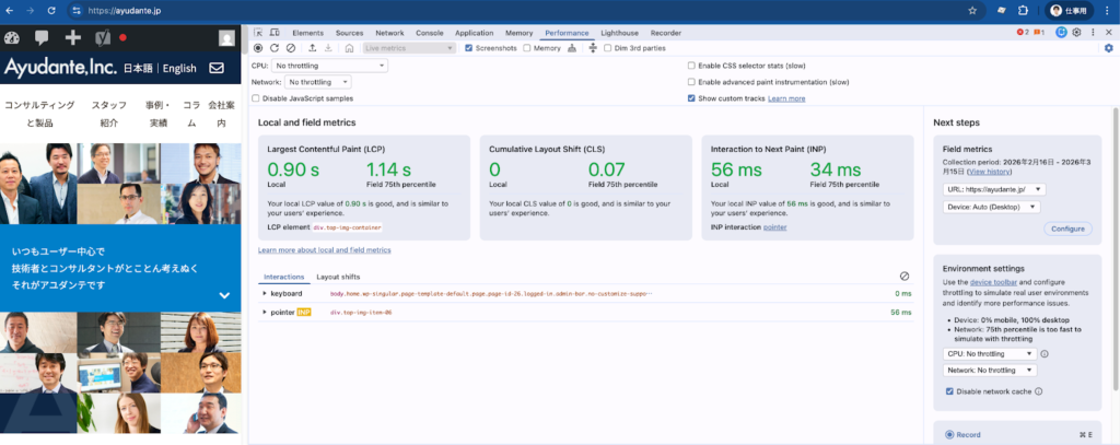 - 今ページを開いたときのCore Web Vitalsのローカルの数値