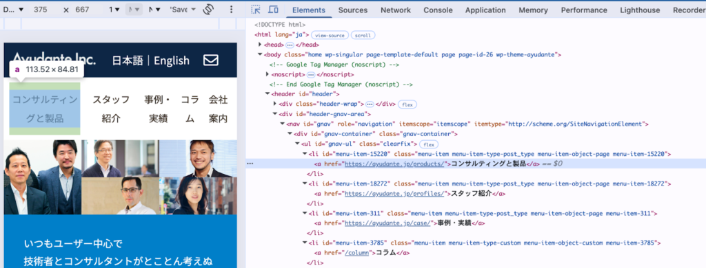 多いですね。検索エンジンやChatGPTのようなAIにちゃんと見てもらえるページの作りをしているか確認するときは、Elementsパネルを使います。