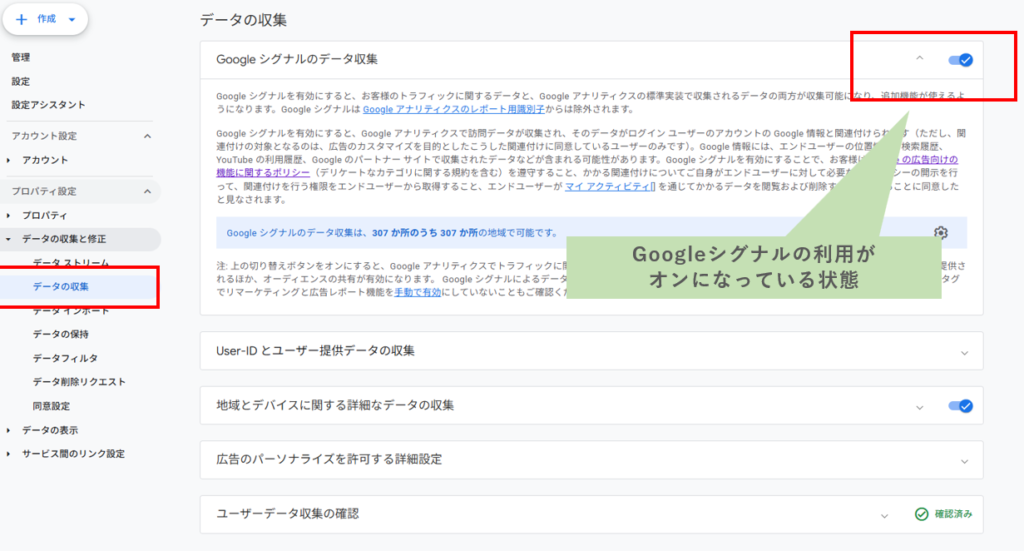 Googleシグナルがオンになっているかは、GA4の管理画面上で「プロパティ設定>データの収集と修正>データの収集」を表示して確認できます。