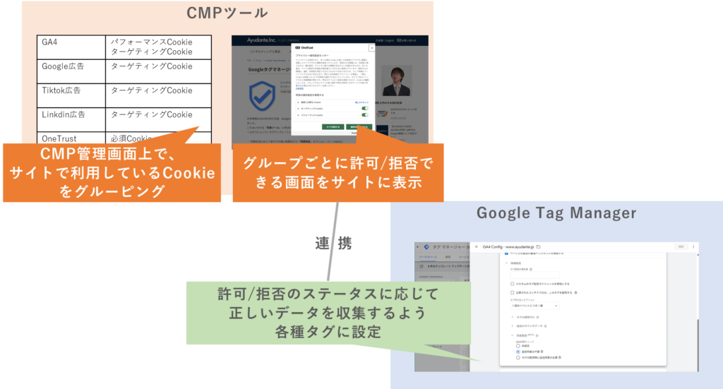 サイト担当者は「どのツールがどのグループに含まれるか」をCMPツール上で定義し、ユーザーが同意を選択できるようバナー表示などを行います。